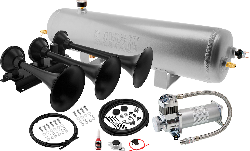 A full train horn system, ready to install. At the heart of this package is the intense triple trumpet air horn, drawing immediate attention. Black color, made entirely of metal for maximum protection against all weather conditions. This system includes a 3 Gallon aluminum air tank, 200 PSI 12 volt air compressor with remote filter kit, pressure gauge, pressure switch, hose, fittings, horn button, thread sealant and mounting hardware. Ideal for all vehicles with a 12V system. A bold, loud choice.